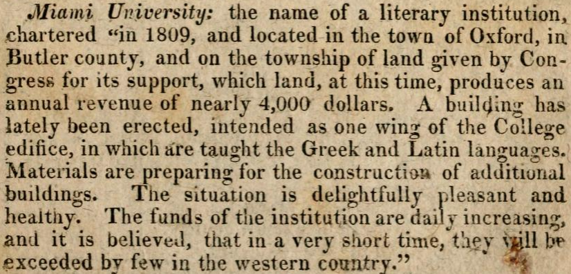 ![The Ohio Gazetteer or Topographical Dictionary 1829 Miami University [...]. A building has lately been erected, intended as one wing of the College edifice, in which are taught the Greek and Latin languages. Materials are preparing for the construction of additional buildings. The situation is delightfully pleasant and healthy. The funds of the institution are daily increasing, and it is believed that in a very short time they will be exceeded by few in the western country.](https://blogger.googleusercontent.com/img/b/R29vZ2xl/AVvXsEgCFyldESoBN8kaWqz9plxzQLfp89wmQ2rKW7ybRNPxHpHUEtMtKrfZHm3ch-FzewKvN_-j0Kiev3lfXOZcgROslbQm4iOTUEH5FRnMXhcQnzmdlhjgQU_JxMqFLLlOiegETcBRrQajFI2ufmCc9jhdTSkHj92RcSVyrObbxQxgEaHD-JzGb3-eAU9V/w640-h306/The%20Ohio%20Gazetteer%20or%20Topographical%20Dictionary%201829.png)